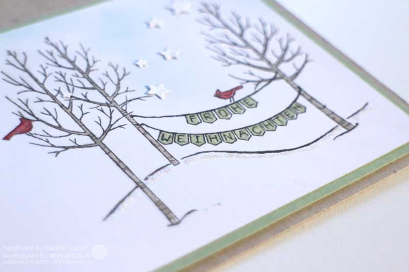 Den Hintergrund der Schneelandschaft aus dem Stempelset Weiße Weihnacht habe ich mit einem Hauch Himmelblau eingefärbt und anschließend den Stempelabdruck mit dem Mischstift coloriert. Dazu hab ich einfach die Farbe mit dem Mischstift vom Stempelkissen (alternativ auch von Markern) aufgenommen und dann den Stempelabdruck ausgemalt. So entsteht ein leichter Aquarelleffekt. Wenn ihr nämlich direkt mit den Markern auf das Papier geht, habt ihr einfach nur einen satten Farbabdruck, den ihr aber nicht mehr verwischen könnt. Wenn ihr aber die Farbe mit dem Mischstift auftragt, verwischt es besser, da die Stifte ja nicht so viel Farbe aufnehmen.