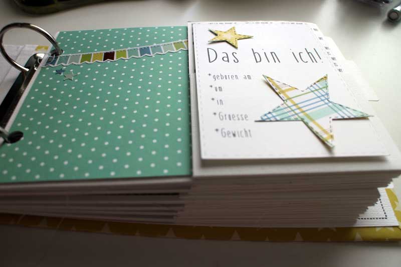 Wenn sich das Tuch weiterhin in den nächsten Tagen so bewährt, besteht tatsächlich die realistische Chance, dass ich endlich unsere Dankeskarten und die Papeterie für eine Hochzeit fertig stellen kann und dann, so Gott will, auch noch freudestrahlend damit anfangen kann, das unfassbar tolle, mit unglaublich viel Zeit und Liebe gewerkelte „Mein erstes Jahr“-Babyalbum zu befüllen, das unser Mini-T. von Dina geschenkt bekam.