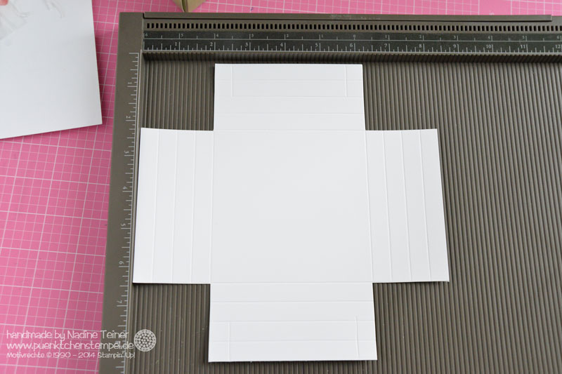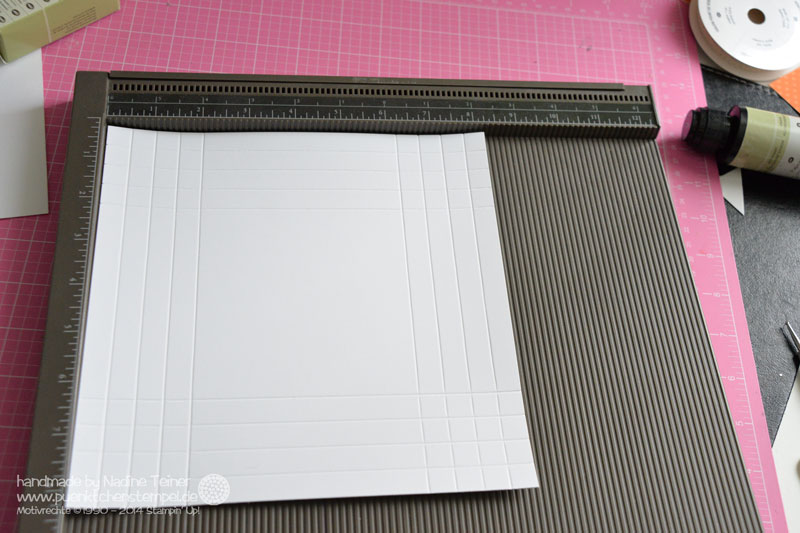 Dieses falze ich an allen 4 Seiten 4 mal und zwar jeweils mit einem Abstand von einem halben Inch. Wieso Inch? Aus dem einfachen Grund, dass ich zu faul bin, unter meinen Tisch zu krabbeln und den Zentimeteraufsatz für das Falzbrett aus dem Regal zu zerren. Das Stampin‘ Up! Falzbrett ist nämlich ein super tolles Gerät, ohne den Aufsatz aber in Inchangaben. Da es mir aber schnurzpieps ist, ob der Rand nun 1 cm breit ist oder 1/2″, siegte die Faulheit und ich hab mal wieder mit Inch gearbeitet.