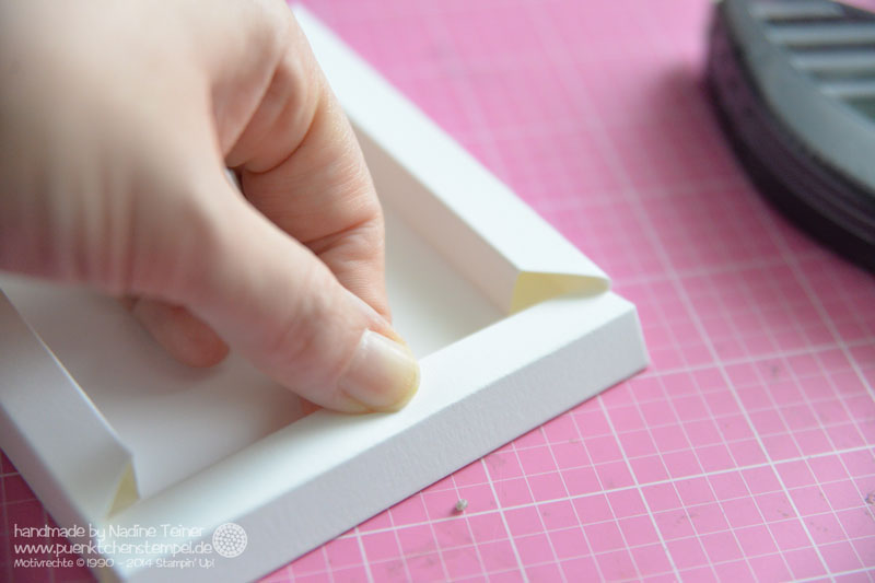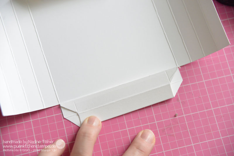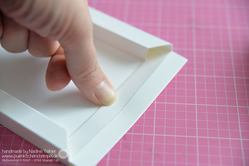 Jetzt wäre auch der Moment, in dem man das Designerpapier in die Mitte kleben sollte, das hab ich aber beim Fotos schießen vergessen. Es ist aber wesentlich leichter das jetzt VORM Verkleben der Ränder zu tun als es im Nachhinein reinfriemeln zu müssen.