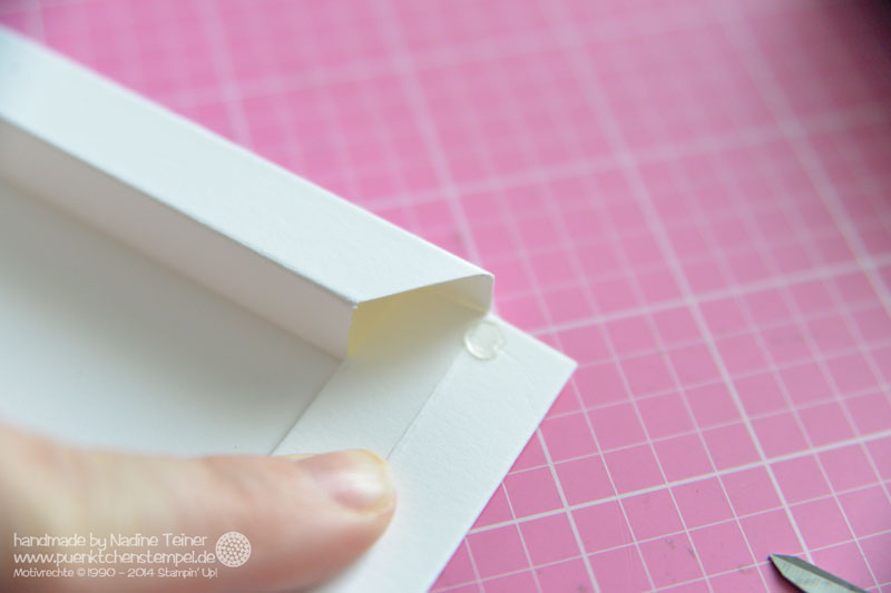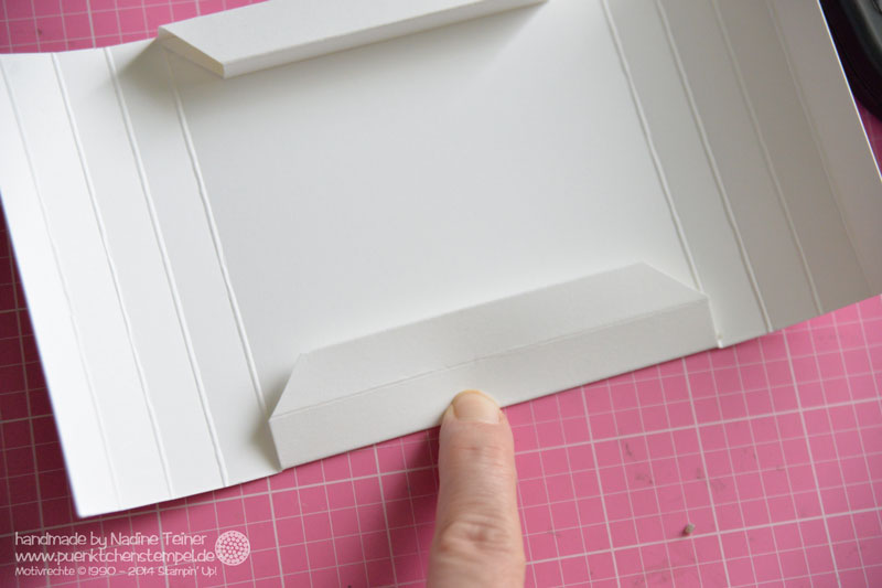 Das geht auch am besten indem man das Ganze flach drückt und unter die Schrägen schiebt. Da hier aber ein bisschen Widerstand ist, ist es am einfachsten am äußeren Rand auf die Falzlinie einen Miniklebepunkt zu setzen und den beim Aufklappen unter der Schräge festzudrücken.